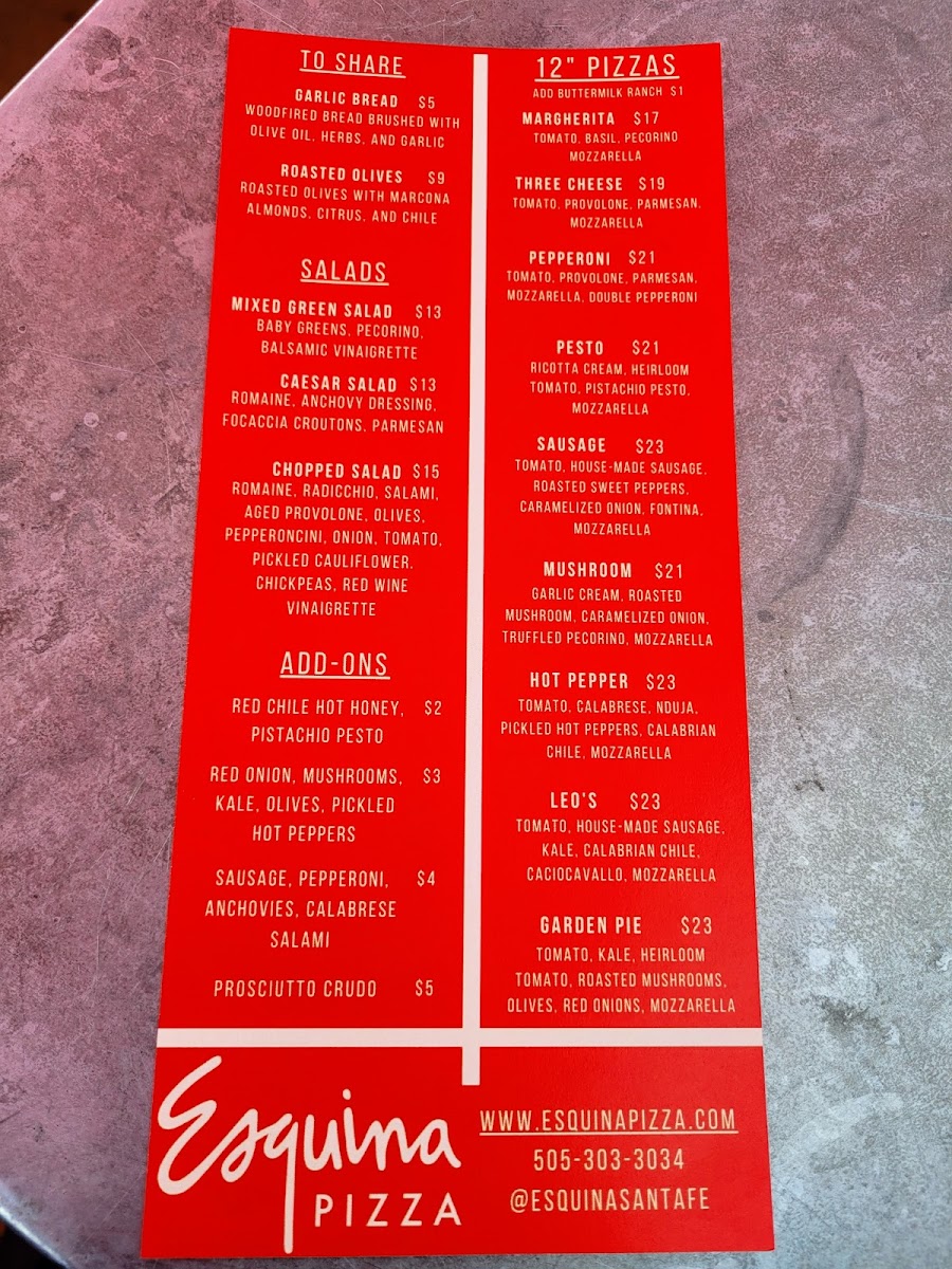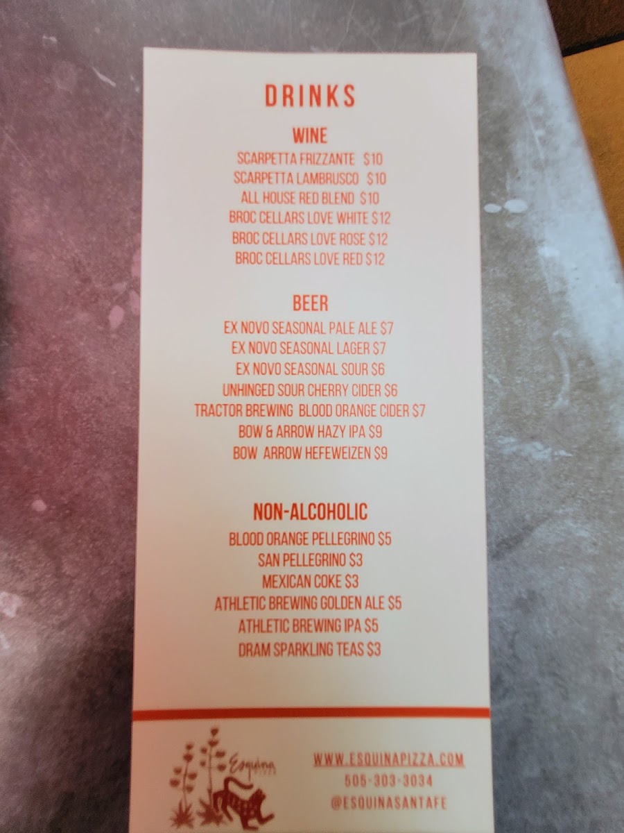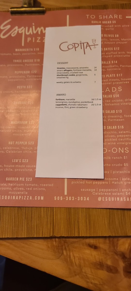 The menu at Esquina Pizza / Copita Wine Bar offers a simple yet flavorful selection, perfect for sharing and enjoying with friends. For starters, the Garlic Bread and D Olives are both classic, savory choices to begin the meal. The BallsTi Plate adds a unique twist to the selection, likely offering a blend of Mediterranean-inspired flavors. The pizza options are equally enticing, with favorites like the Three Cheese pizza, rich in cheesy goodness, and the Pepperoni pizza, a timeless choice for those craving something hearty. For a more adventurous option, the PestoSausage pizza combines the aromatic flavors of pesto with a savory sausage topping, while the Mushroom pizza caters to vegetarian tastes with its earthy, fresh mushroom topping. With a range of options, Esquina Pizza / Copita Wine Bar’s menu balances variety and simplicity, making it a perfect spot for those looking for delicious, straightforward dishes.